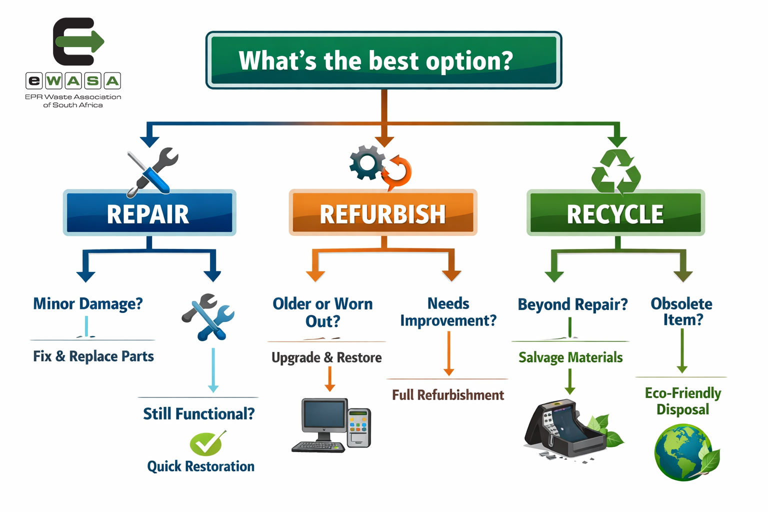 When reusable equipment is identified early, producers avoid pushing viable devices straight into shredding or landfill. That creates measurable diversion from premature disposal and a more credible EPR performance story. eWASA’s own guidance frames repair, donation, resale and trade-in as the preferred route for working electronics, while broken end-of-life devices should move into compliant recovery channels.